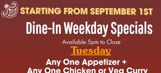 Saffron is happy to introduce weekday evening specials, available only for dine-in customers;